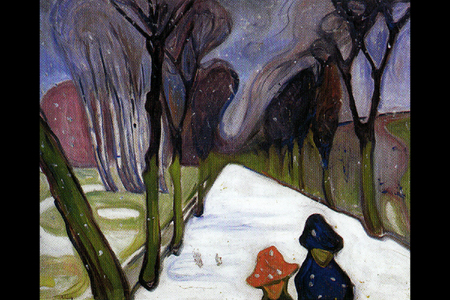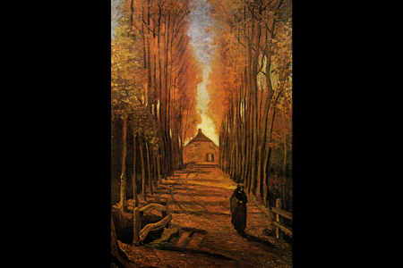 Zeigt eine von Schnee bedeckte Allee, die durch eine farbenfrohe Winterlandschaft führt, wobei die Allee selbst in leuchtendem Weiß erstrahlt und einen starken Kontrast zum grünen und blauen Himmel bildet. Es ist ein bekanntes Werk des Künstlers und ein Beispiel für Munchs einzigartige, farbintensive Interpretation von Schneelandschaften, die im Munchmuseet in Oslo zu sehen ist. Pappelallee im Herbst. Vincent van Gogh. 1884 . Das Gemälde zeigt eine herbstliche Allee, die den Blick der Betrachter:innen auf ein Gebäude im Hintergrund lenkt. Die hohen, dicht stehenden Bäume bilden einen natürlichen „Tunnel“ und strukturieren den Raum klar: Vordergrund (Weg und Figur), Mittelgrund (Allee), Hintergrund (Gebäude). Durch diese Perspektive entsteht Tiefe und eine starke Blickführung.
